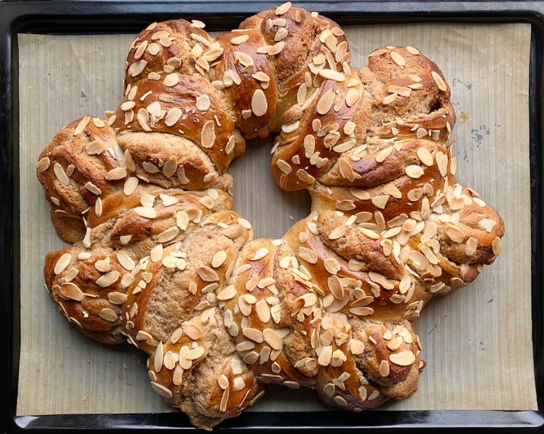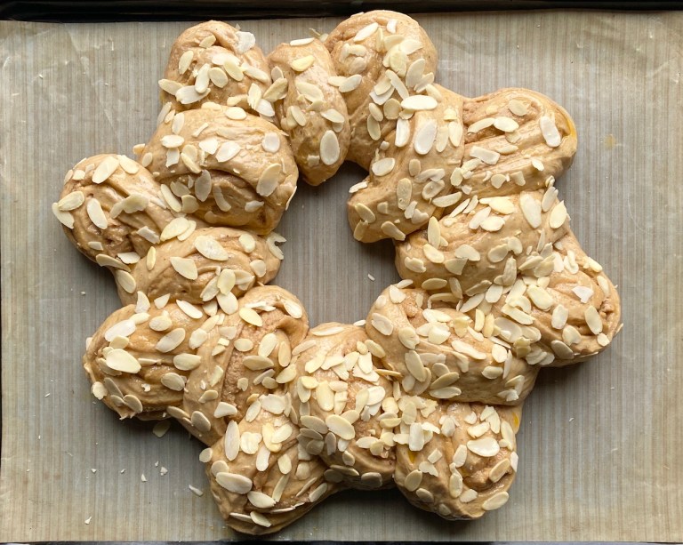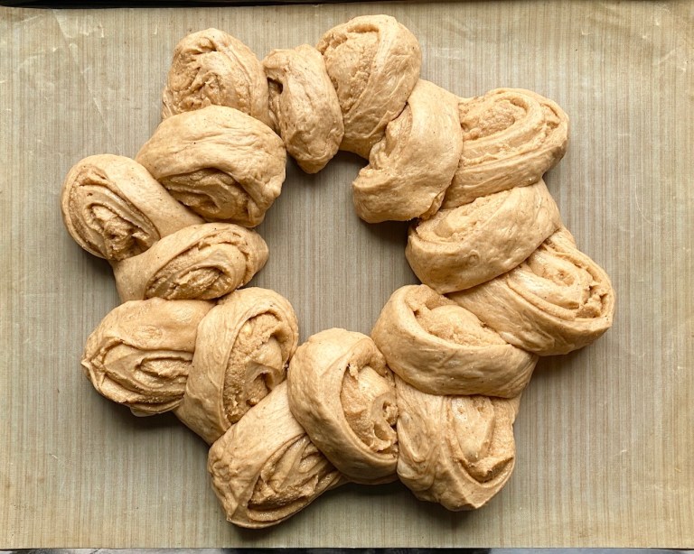 bakepapirkledt stekebrett og form en krans. Pass på at skjøten er under.