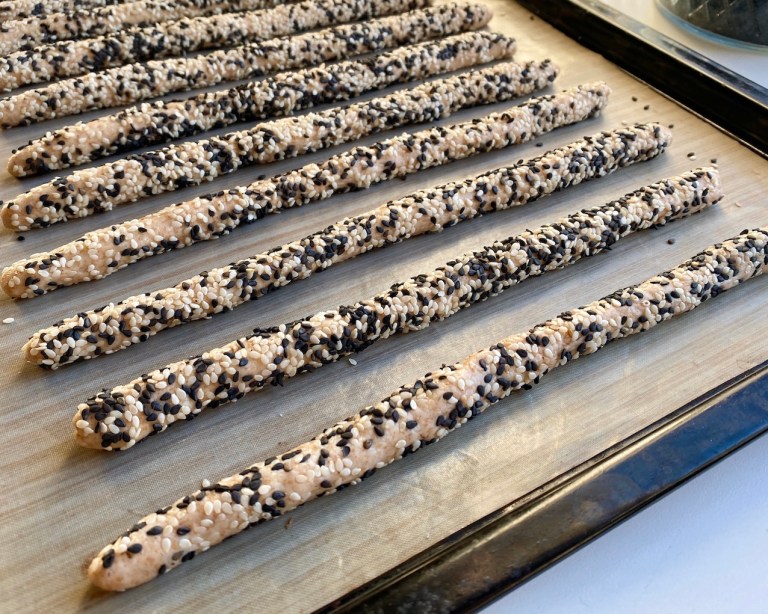 Rull hvert emne til ca. lillefingertykkelse og rull i en sesamfrøene. Legg