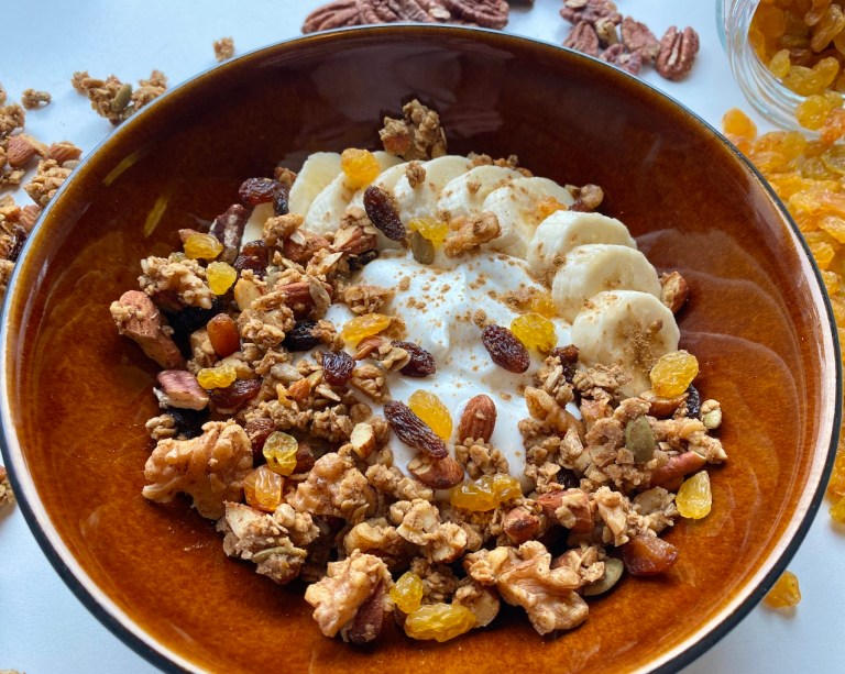 Har du prøvd hjemmelaget granola med mandelmelk og banan?