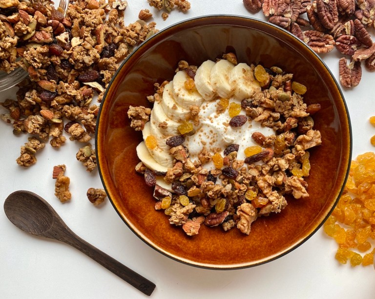 Har du prøvd hjemmelaget granola med mandelmelk og banan?