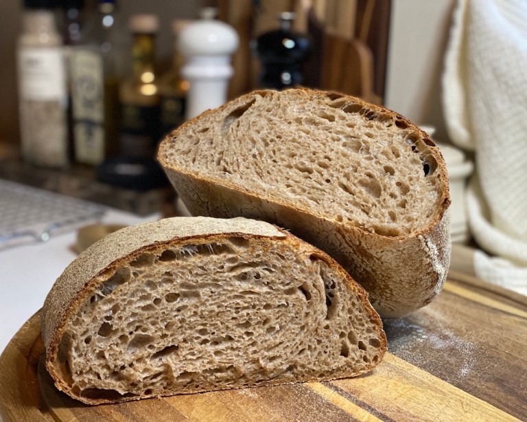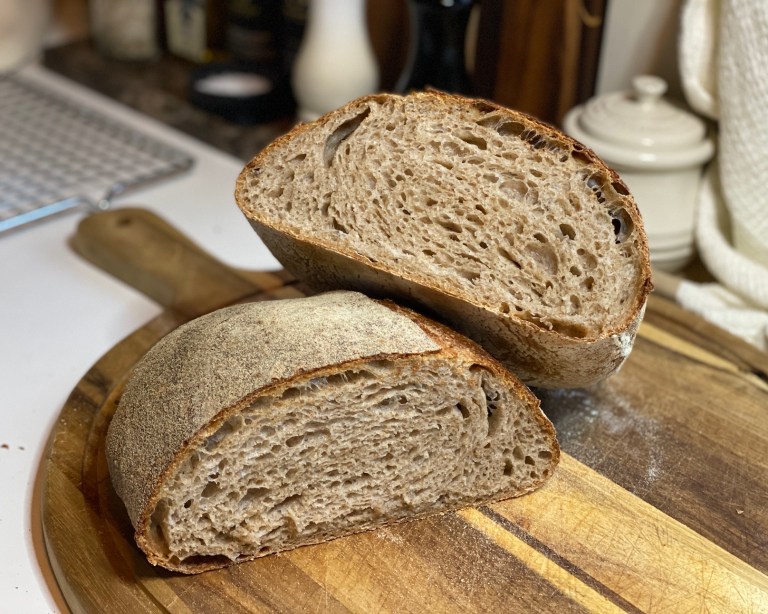 Luftig og saftig surdeigsbrød med 50% fullkornshvetemel.