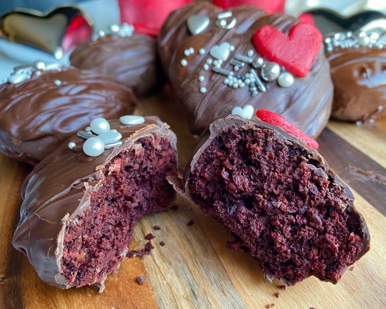 Skikkelig gode små sunnere red velvet kaker med sjokoladetrekk.