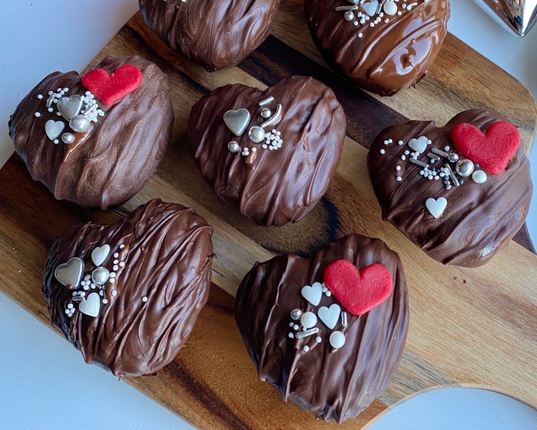Pynt de med sprinkles før sjokoladen stivner. De røde små