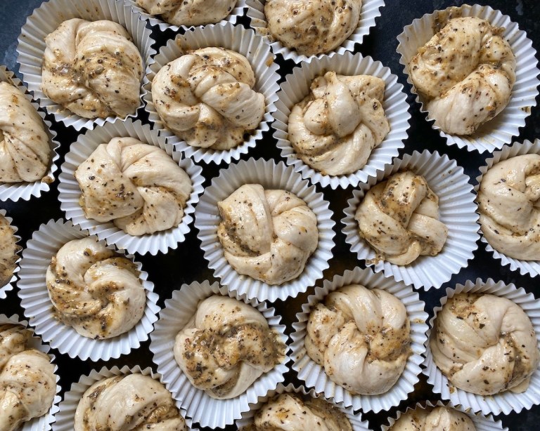 og knyt de til knuter med endene under når du legger de i muffinsformer.