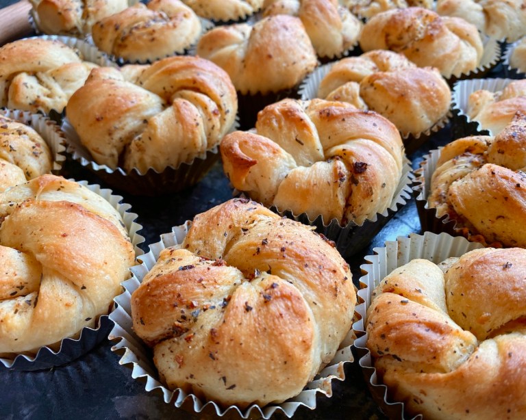 Pensle gjerne knutene med ekstra smeltet hvitløkssmør med en gang de kommer