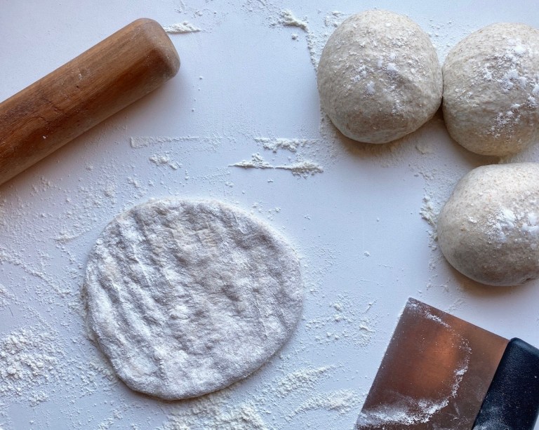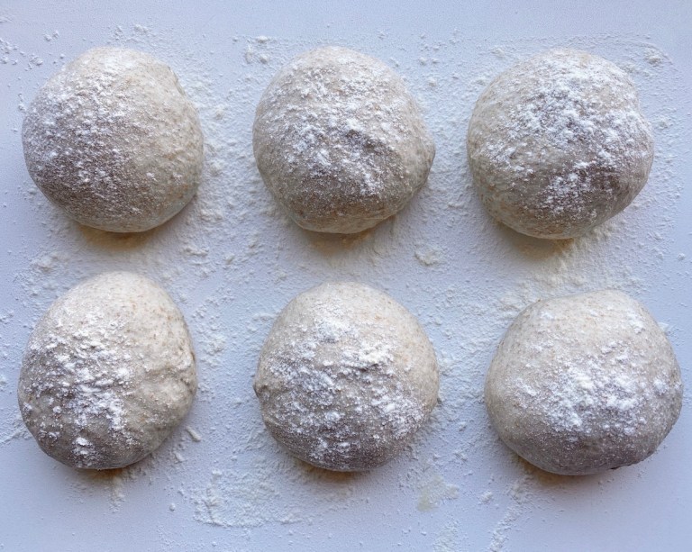 Ha litt hvetemel på benken, velv ut deigen og del den i 6 emner.