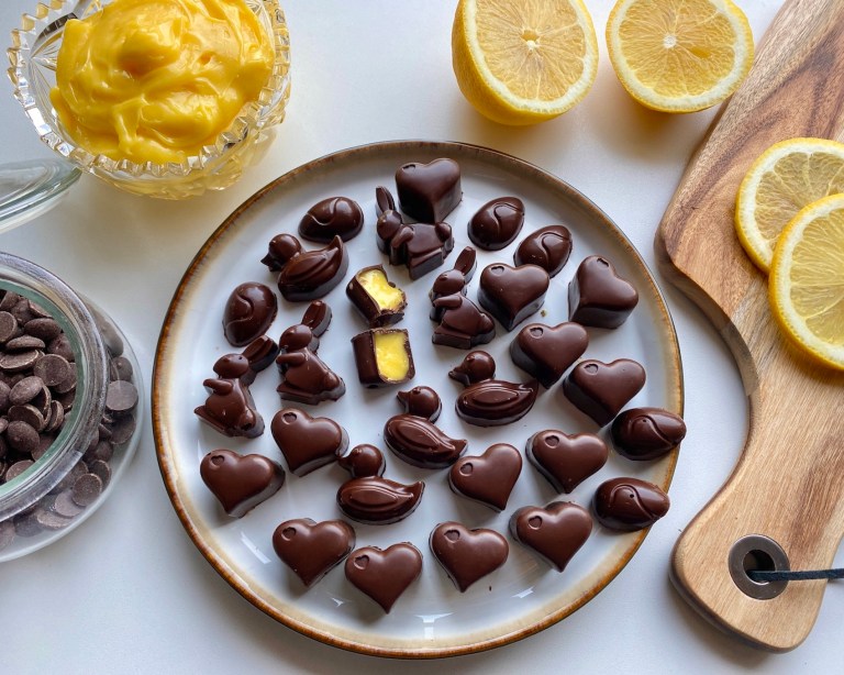 Når sjokoladeskallene har stivnet fyller du de med sitronkrem. Ikke helt opp!