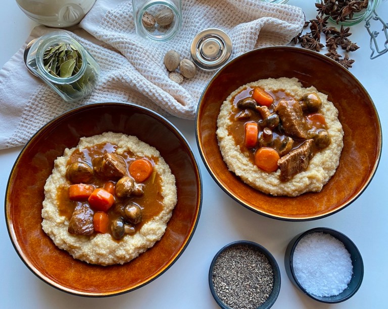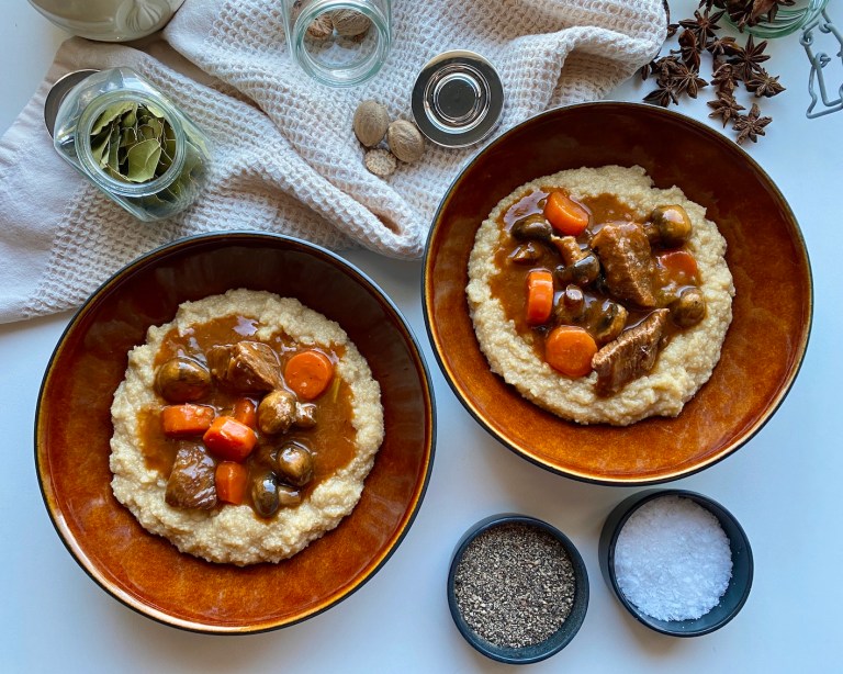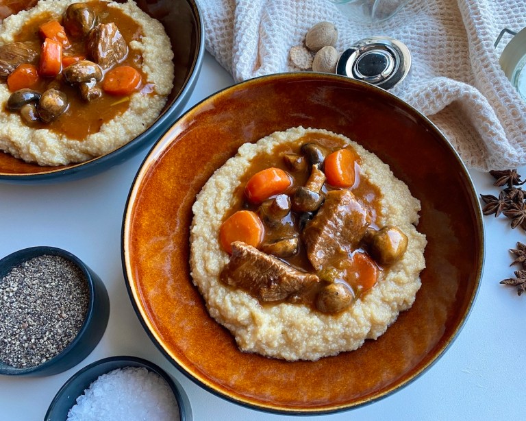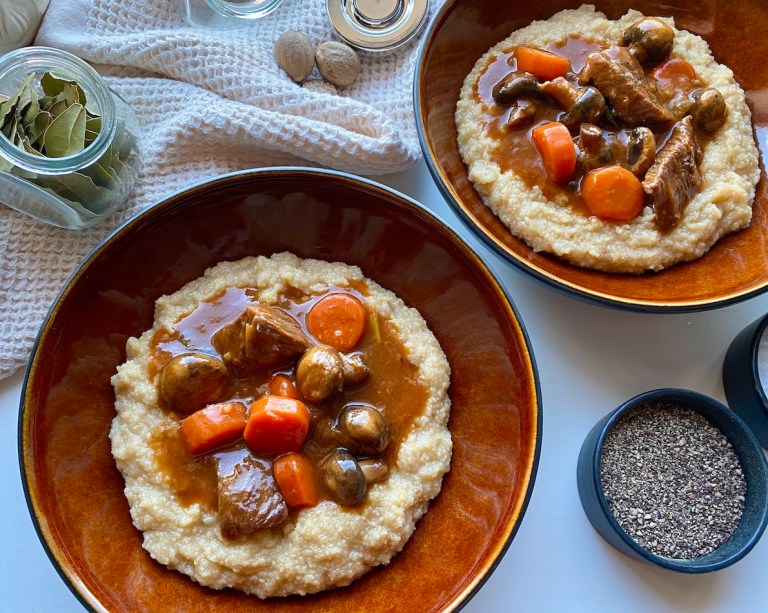 Polenta er nydelig til denne gryten men du kan også ha potetmos til 🙂