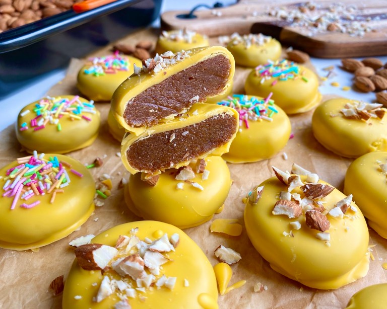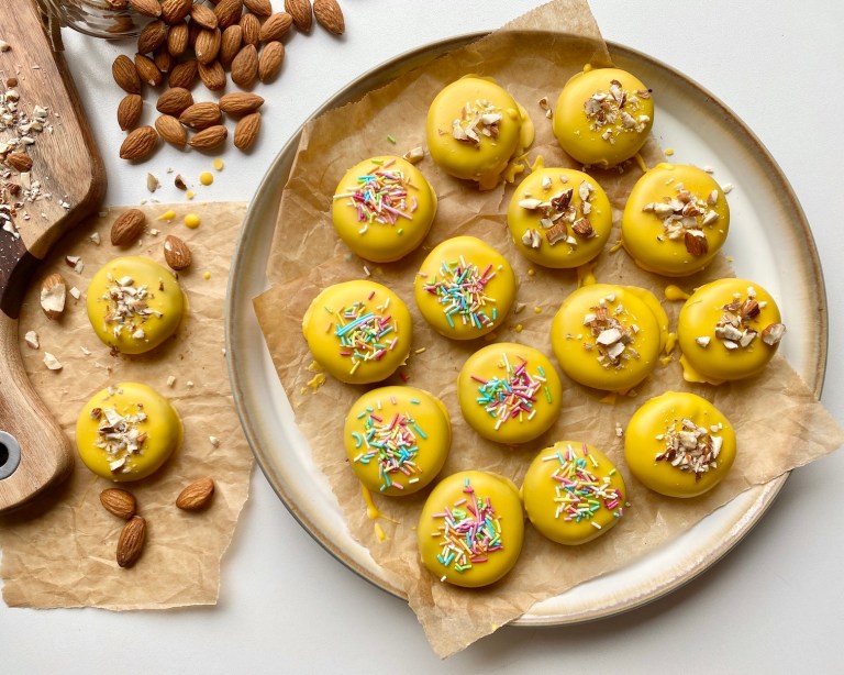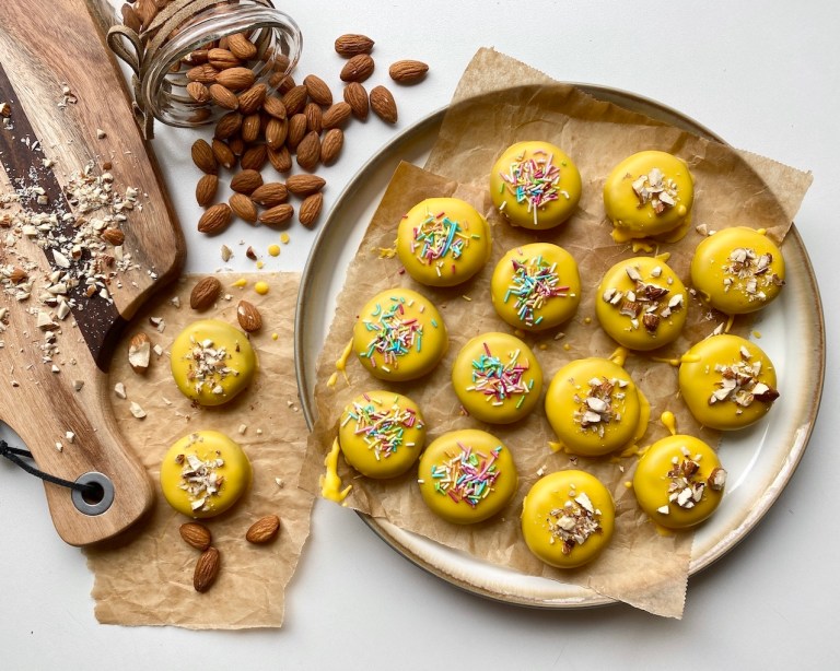 De er dyppet i gul deco melts og toppet med ristede hakkede mandler