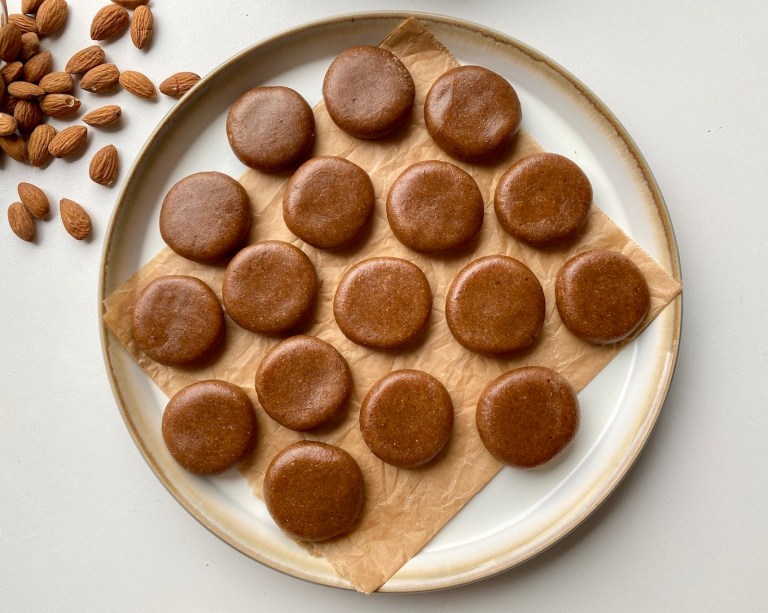 de er helt runde, legg de på et bakepapir og trykk de litt flatere med håndbaken.