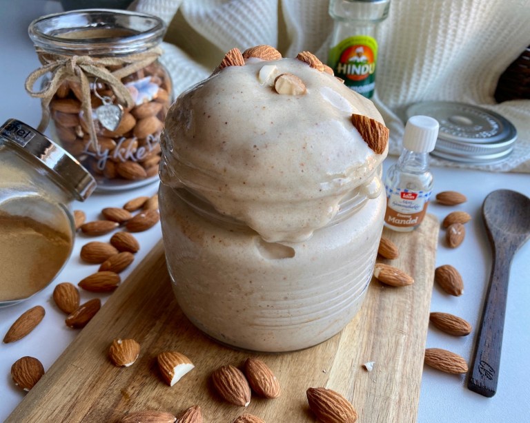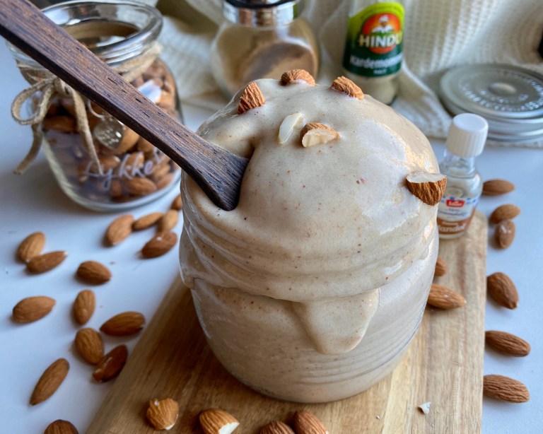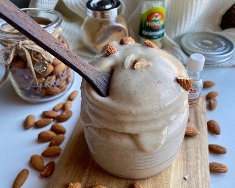 komme sammen. Tilsett mandelsmørblandingen og kjør det til ferdig nice cream,