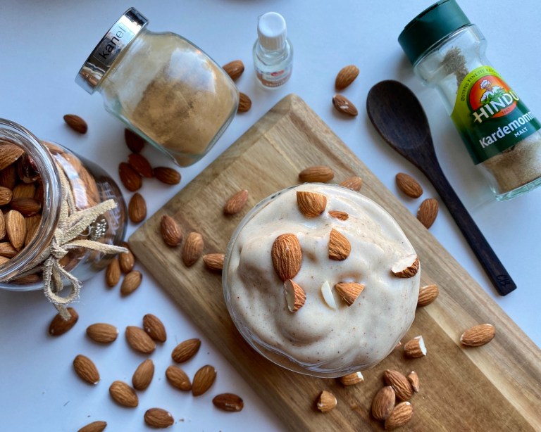 kardemomme, 40 g mandelmelk og mandelessens. Start med 10 dråper!