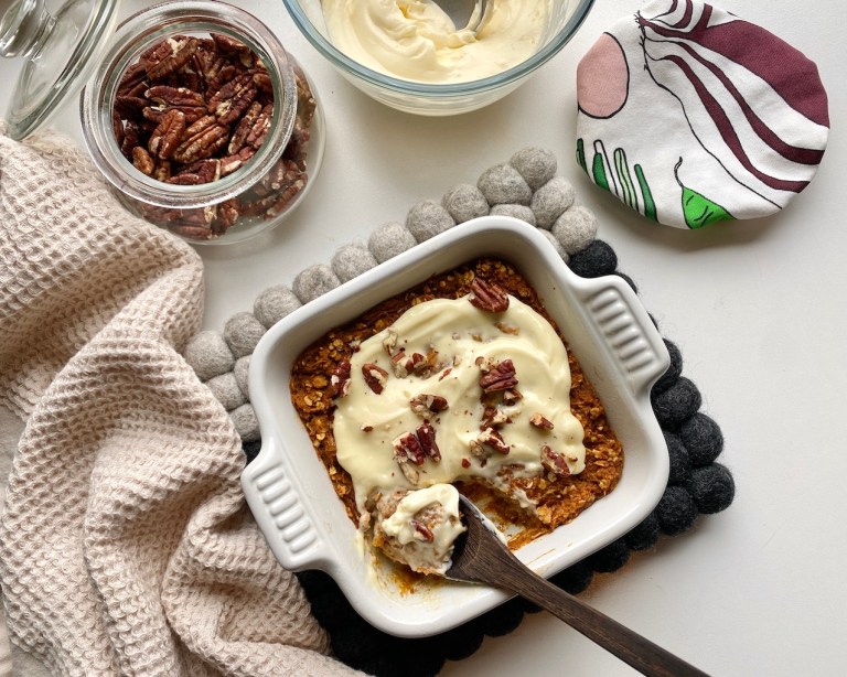 Ovnsbakt havregrøt med gulrot, kremost og pekannøtter