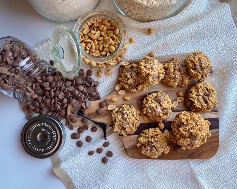 Vend inn havregryn, havremel og sjokolade. Med to spiseskjeer lager du 11 cookies