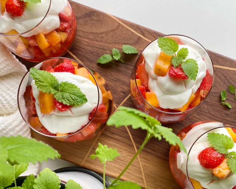 Topp med vaniljeyoghurt og pynt med mango, jordbær og sitronmelisseblader.