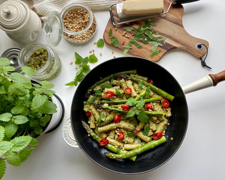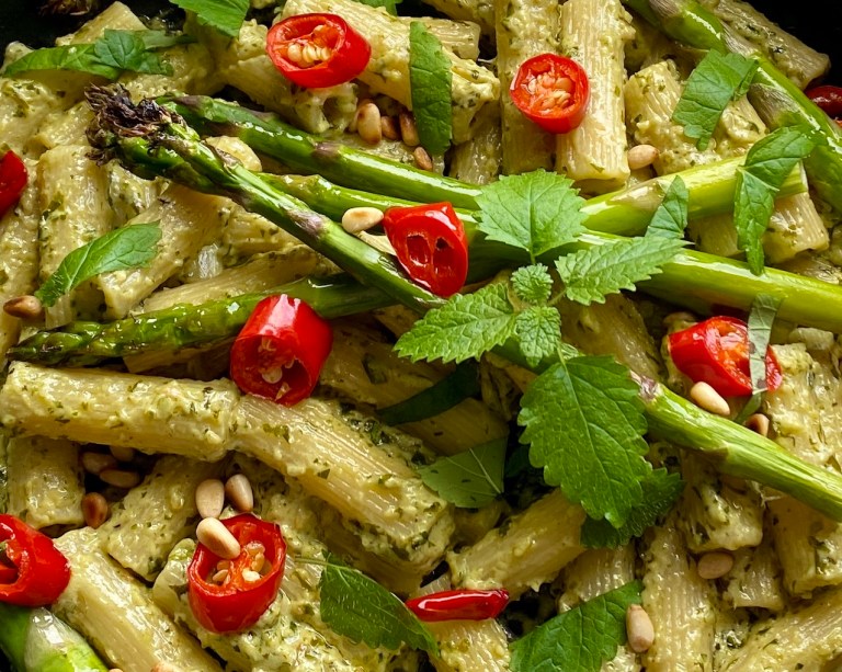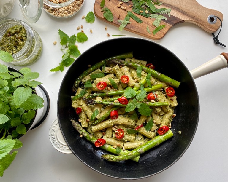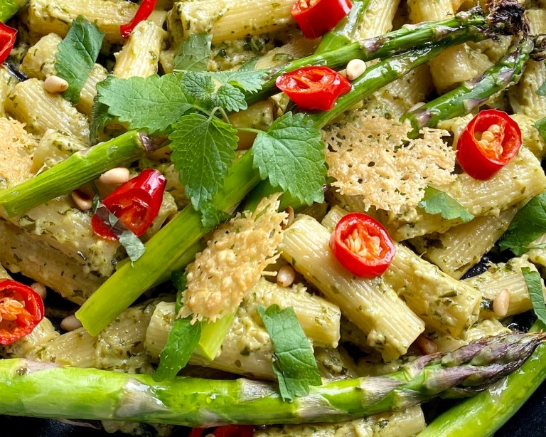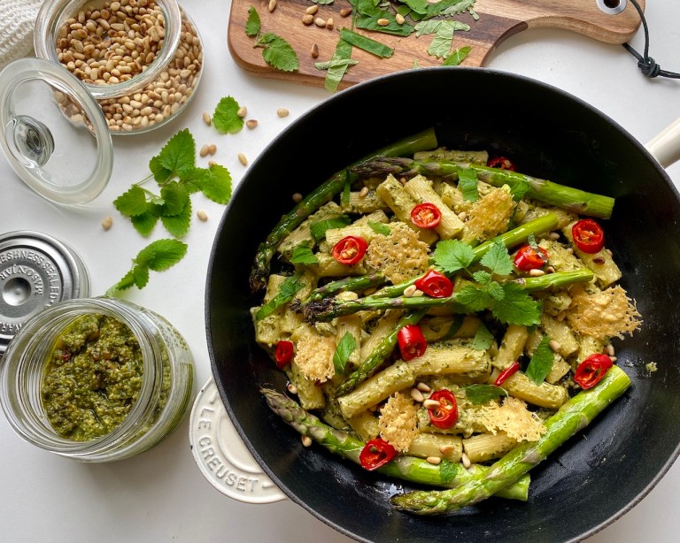 Oppskrift på hjemmelaget pesto har du her! Med ovnsgrillet asparges og