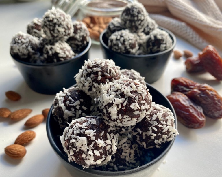I en skål har du kokosmasse som kulene rulles i til slutt.