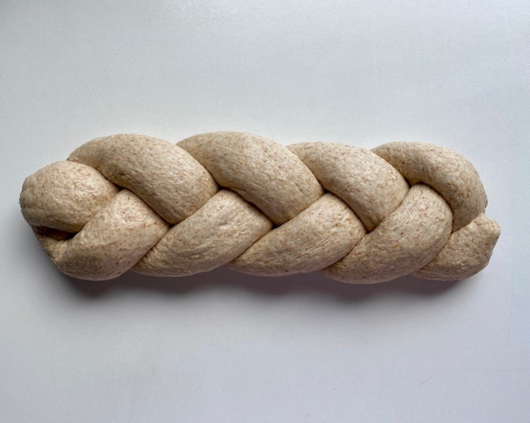 Flett de løst sammen og legg deigen i en smurt brødform med endene under.