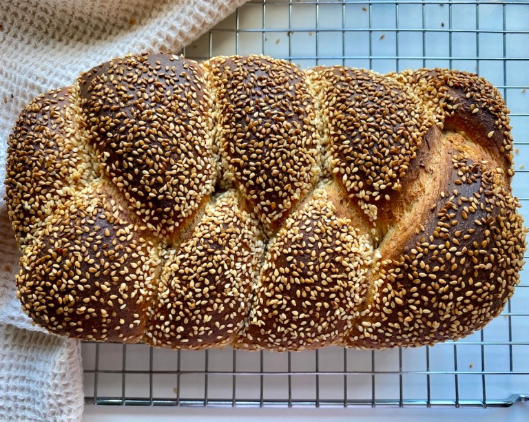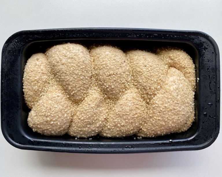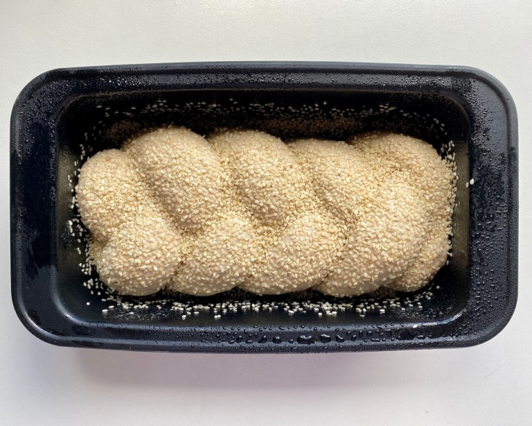 Pensle over med vann og strø på sesamfrø. Dekk til med plastfolie og