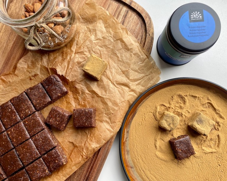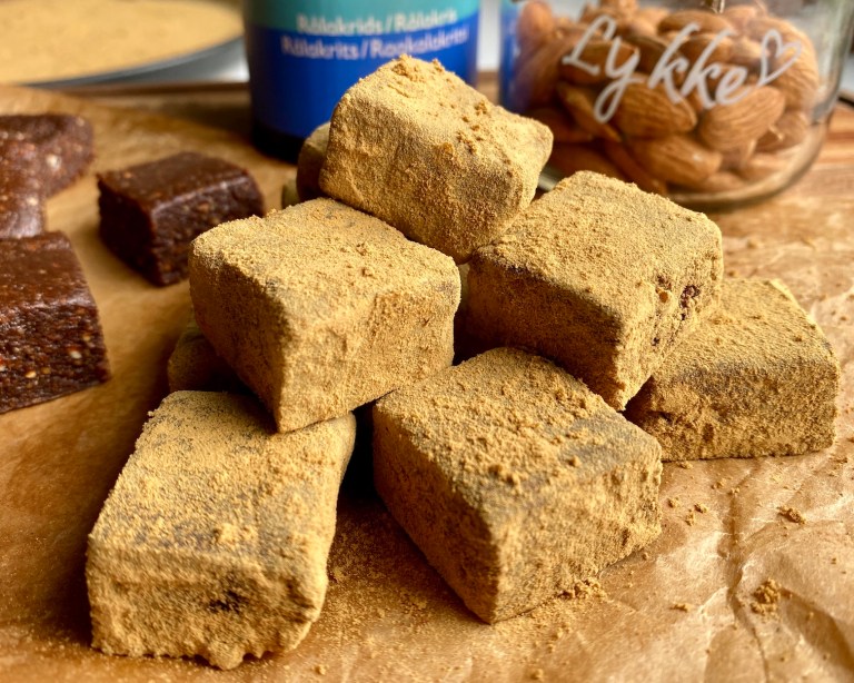i passe biter. I en skål har du lakrispulver som bitene vendes i til slutt.