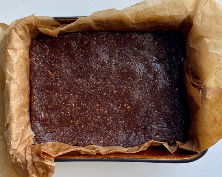 Ha massen over i en liten firkantet form med bakepapir og trykk den jevnt