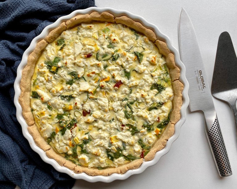 Trykk deigen ut i en smurt ildfast paiform, 26-28 cm, og ha deretter på fyllet.