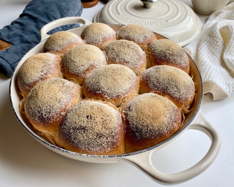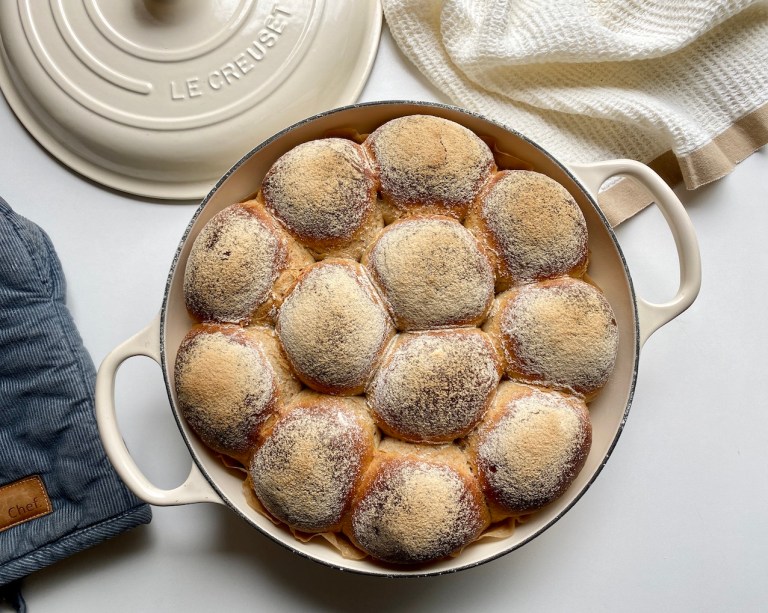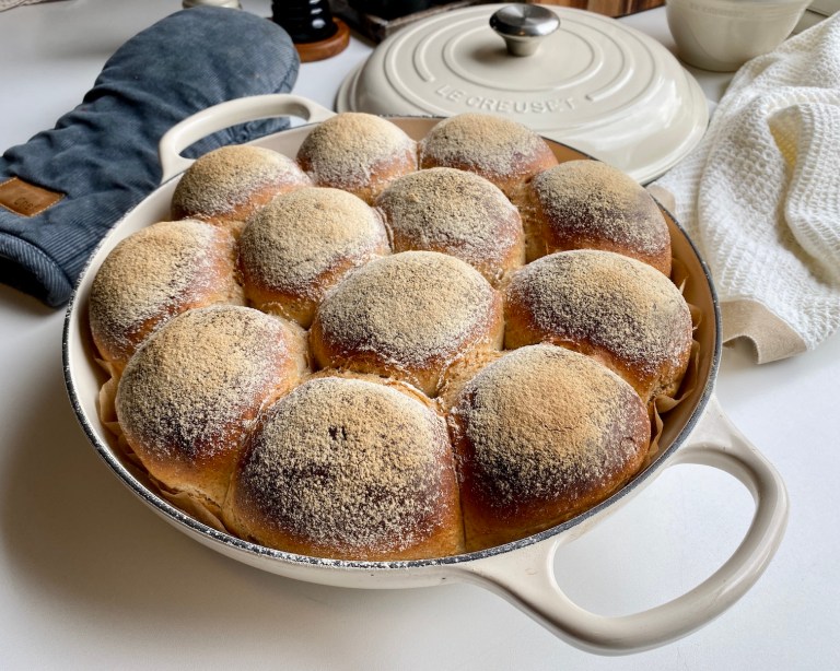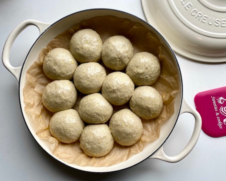 Le Creuset panne. Pisk 1 egg med 1 ss vann og pensle over. Sett på et