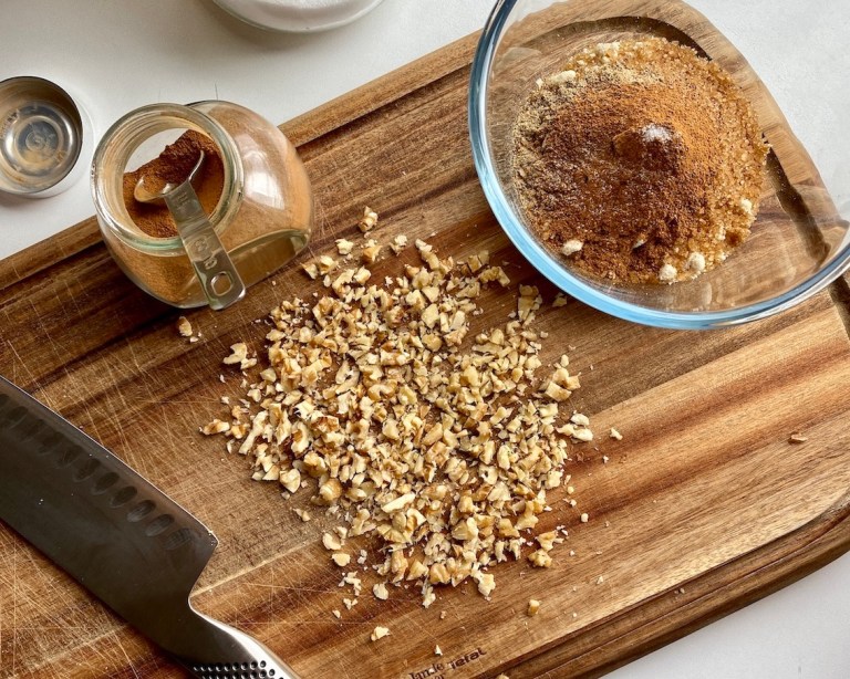 Bland sammen brunt sukker, havregryn, mandelmel, kardemomme, kanel, salt og