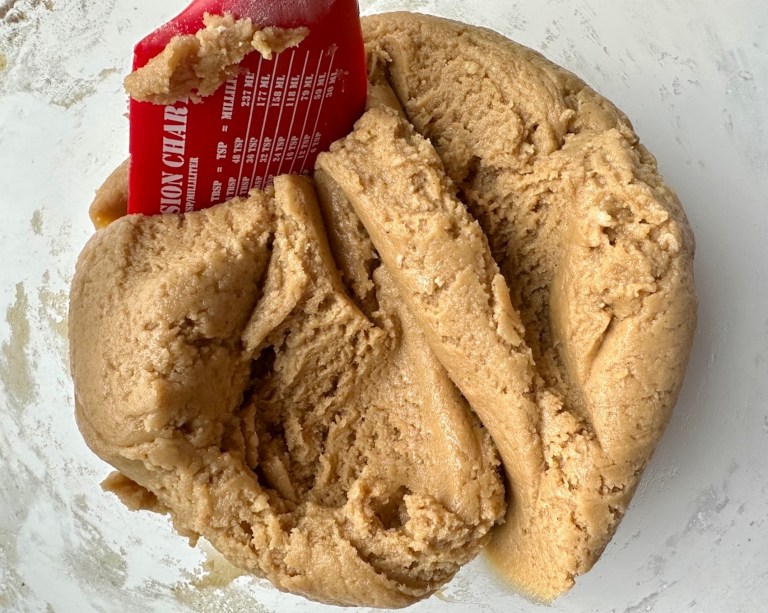 Scoop opp 1 stor spiseskje deig og rull kuler med hendene. Deigen er
