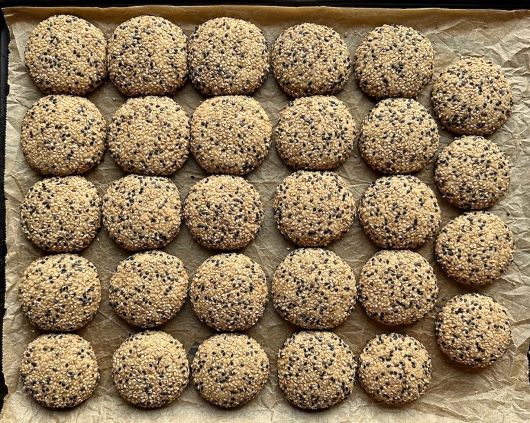 med en valnøtt. Vend de rundt i sesamfrøene så hele blir dekket. Legg de på et