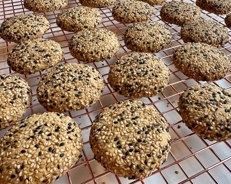 er laget av sesamfrø, og så er de vendt i sesamfrø før de ble stekt.