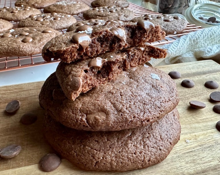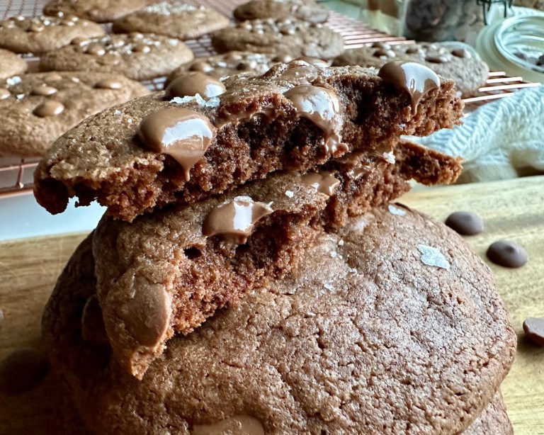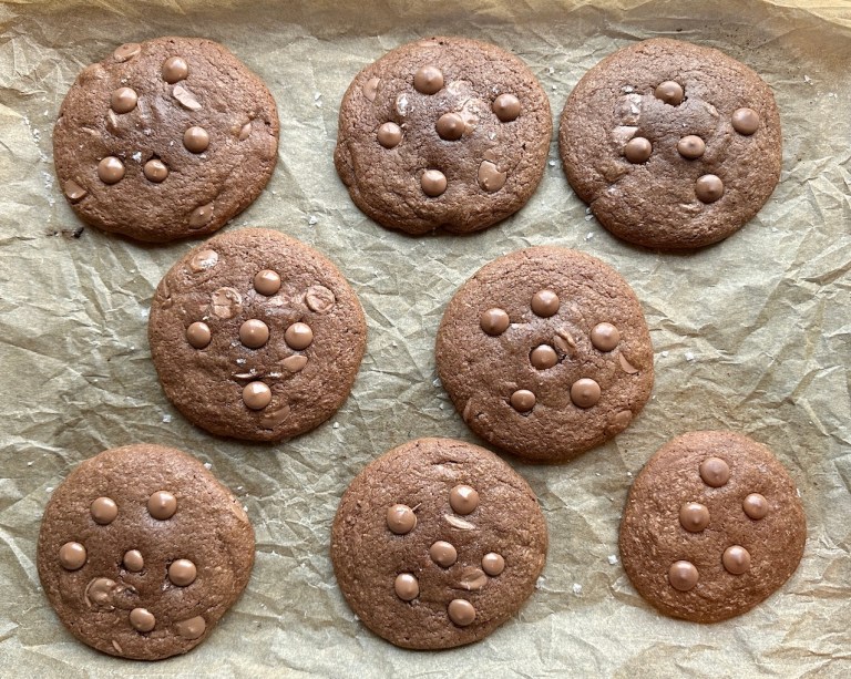 Ta de ut av ovnen og trykk gjerne noen ekstra sjokoladeknapper ned i de mens