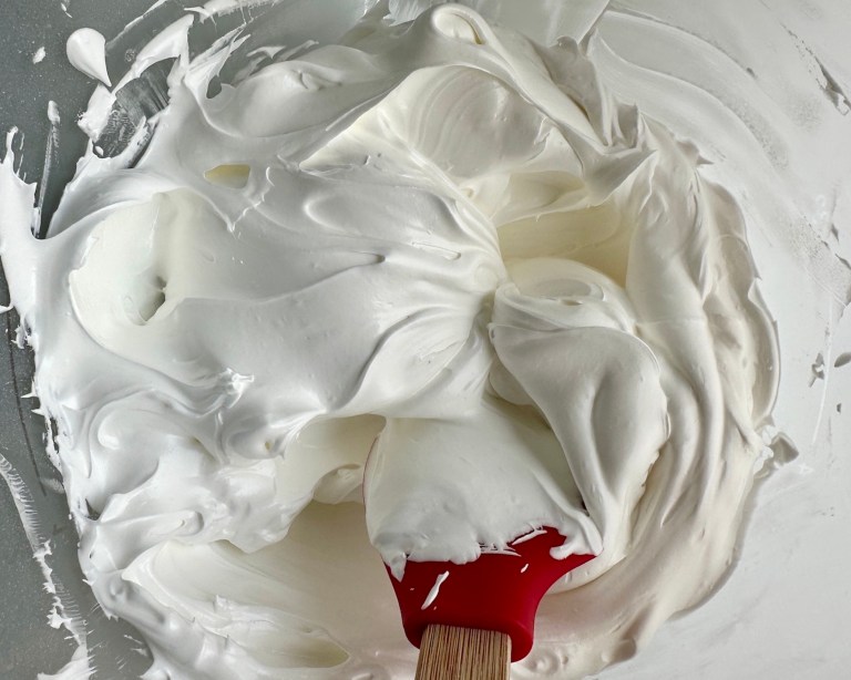 i eggehvitene mens du pisker på middels hastighet. Fortsett å piske i noen
