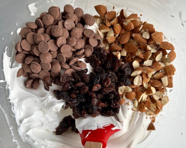 sjokoladeknapper og rosiner. Vend det inn med en slikkepott.