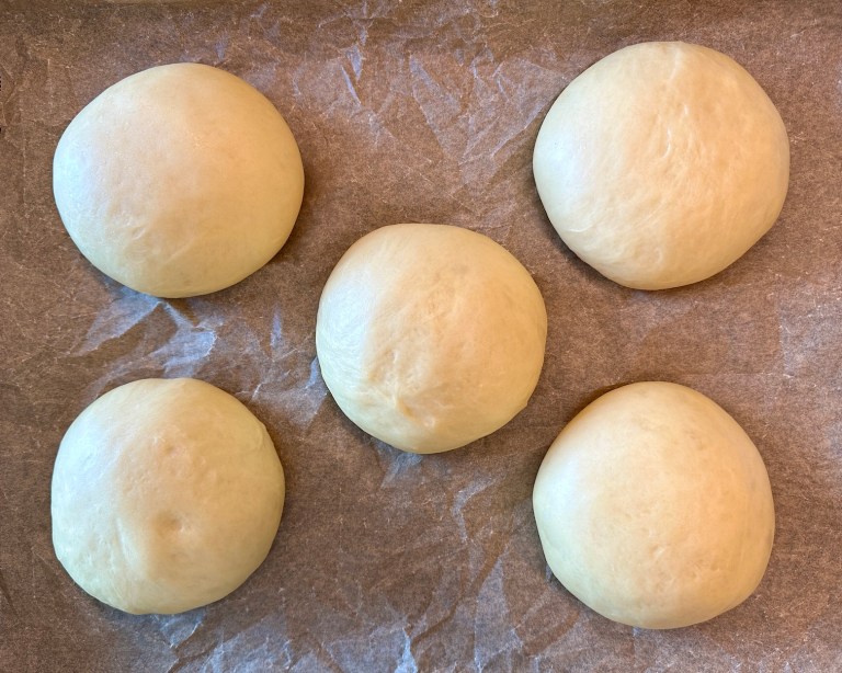 Velv deigen over på kjøkkenbenken, del den i 5 emner som du ruller til boller.