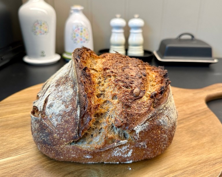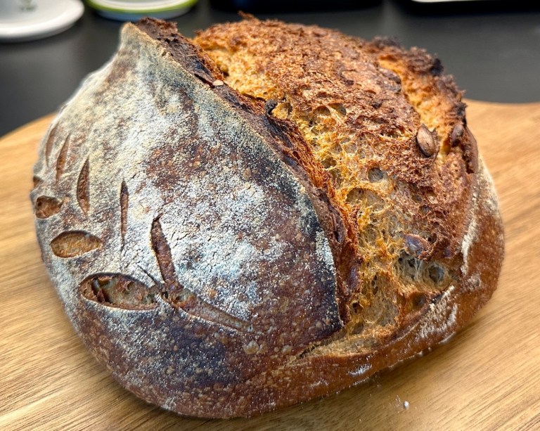 Nytt og grovt surdeigsbrød med gresskarkjerner.