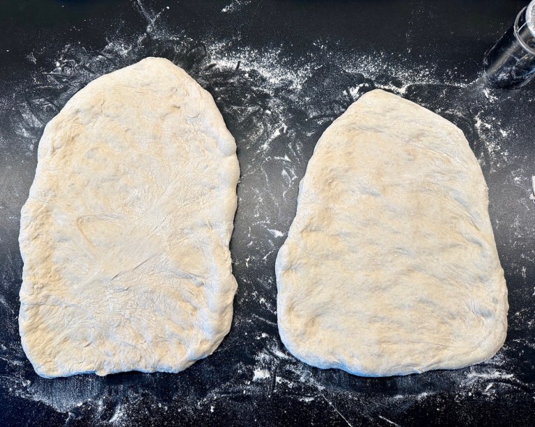 Velv deigen ut av bakebollen. Del den i 2 og form de til to avlange former.