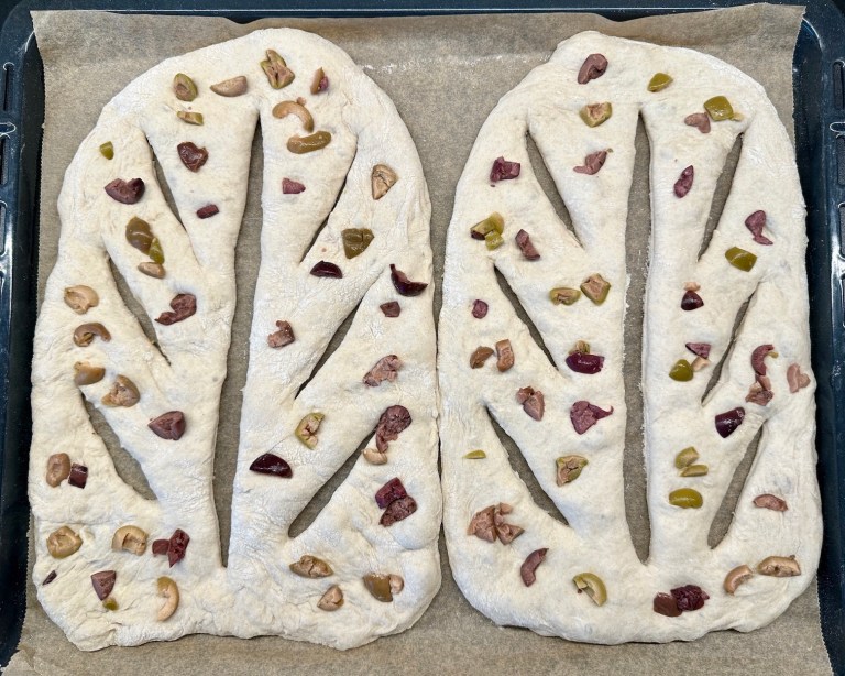 Grovhakk noen oliven, strø over deigen og trykk de forsiktig litt ned.