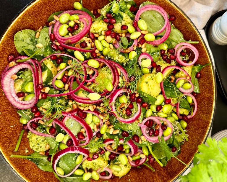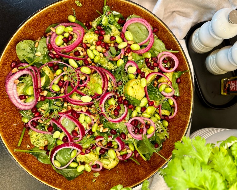 Strø over edamamebønner, granateplekjerner og pinjekjerner.