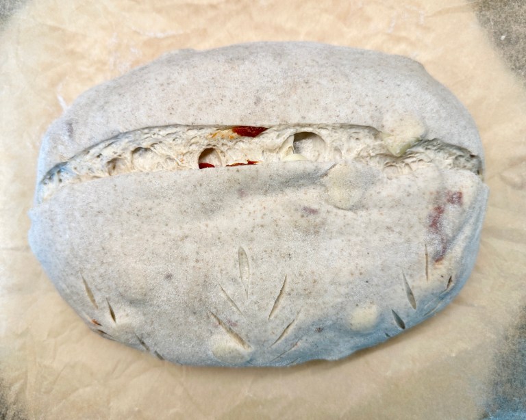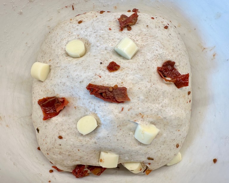 Her er et utrolig godt brød med biter av mozzarella sticks og soltørket tomat.