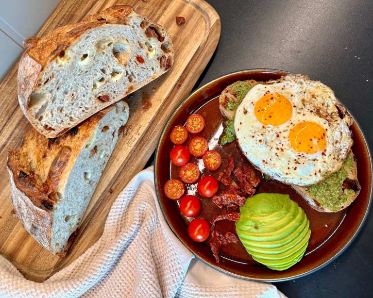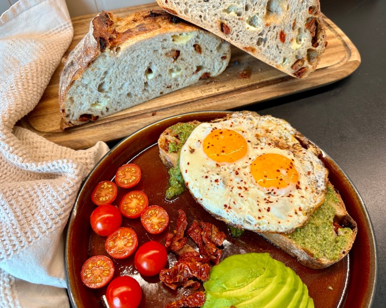 Brødet er nydelig med pesto og stekte egg på. Eller dypp biter av