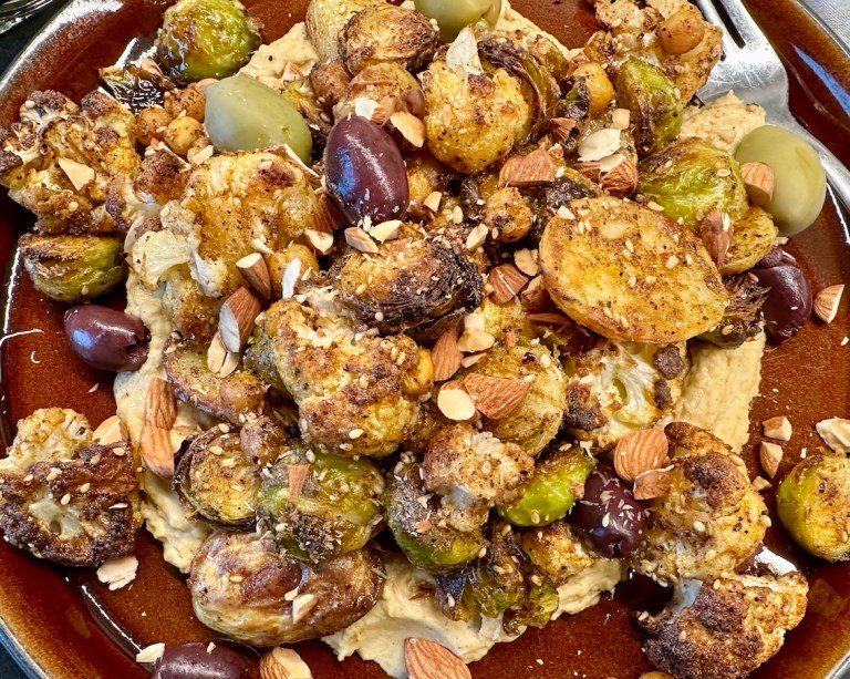 Bre hummus ut på tallerkener, legg over de ferdige grønnsakene, risle over