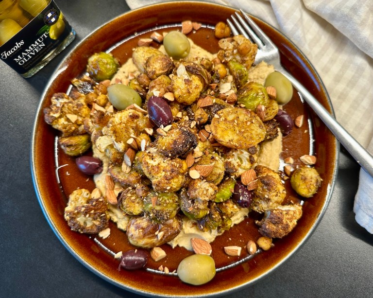 Bre hummus ut på tallerkener, legg over de ferdige grønnsakene, risle over