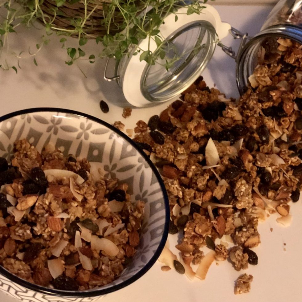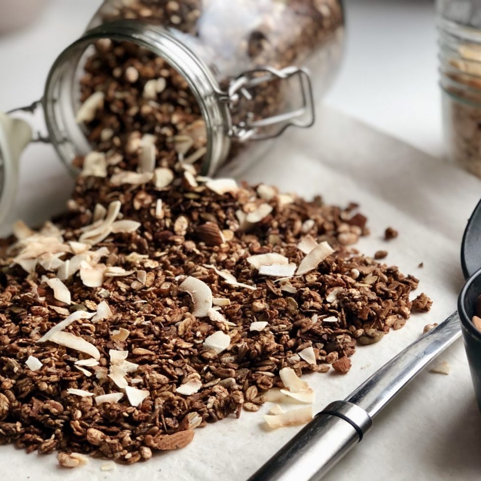 Hjemmelaget granola med kakao, puffet ris og ristede kokosflak og mandler