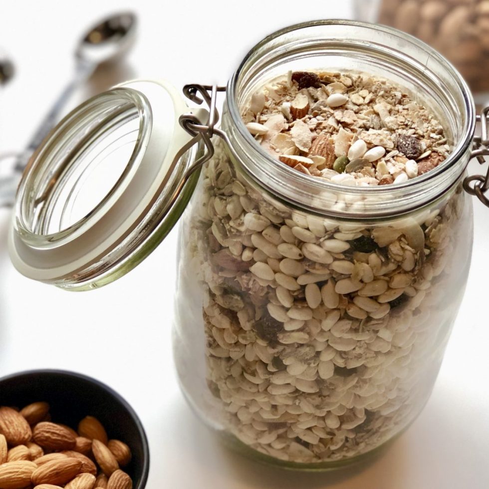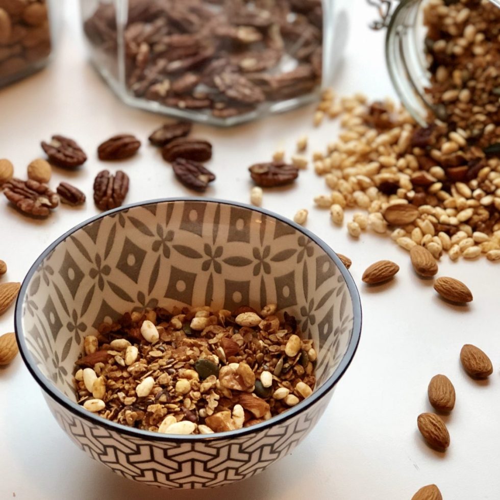 Hjemmelaget granola med 3 slag nøtter og puffet ris