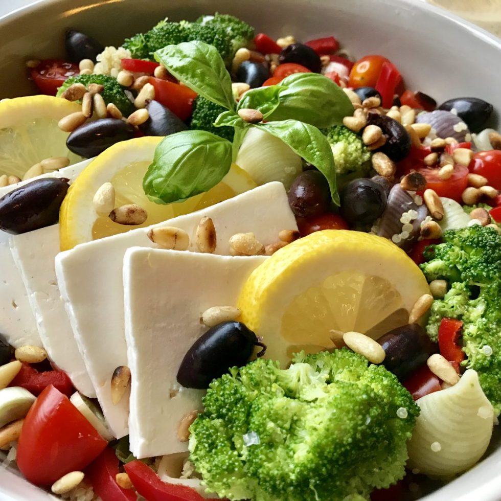 Pasta og quinoasalat med fetaost og kalamata oliven