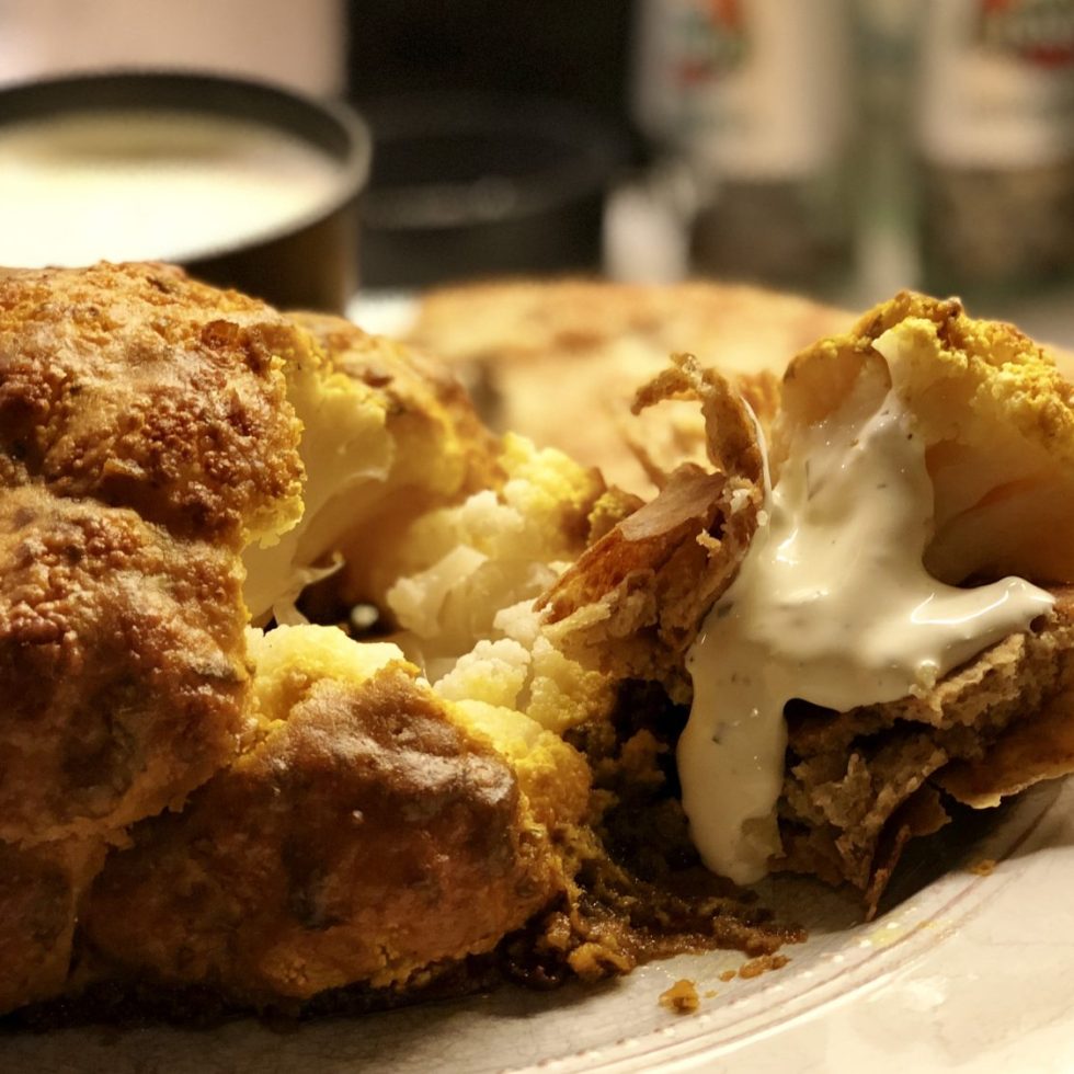 Hel ovnsstekt blomkål med halvgrove roti brød