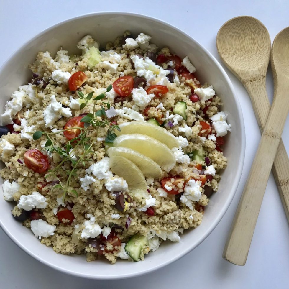 Couscous salat med feta, asparges, paprika og cherrytomater