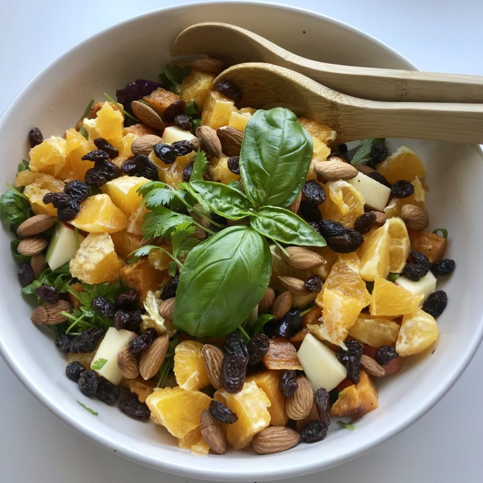 Salat med bakt søtpotet og rødløk – med frukt, mandler og appelsindressing