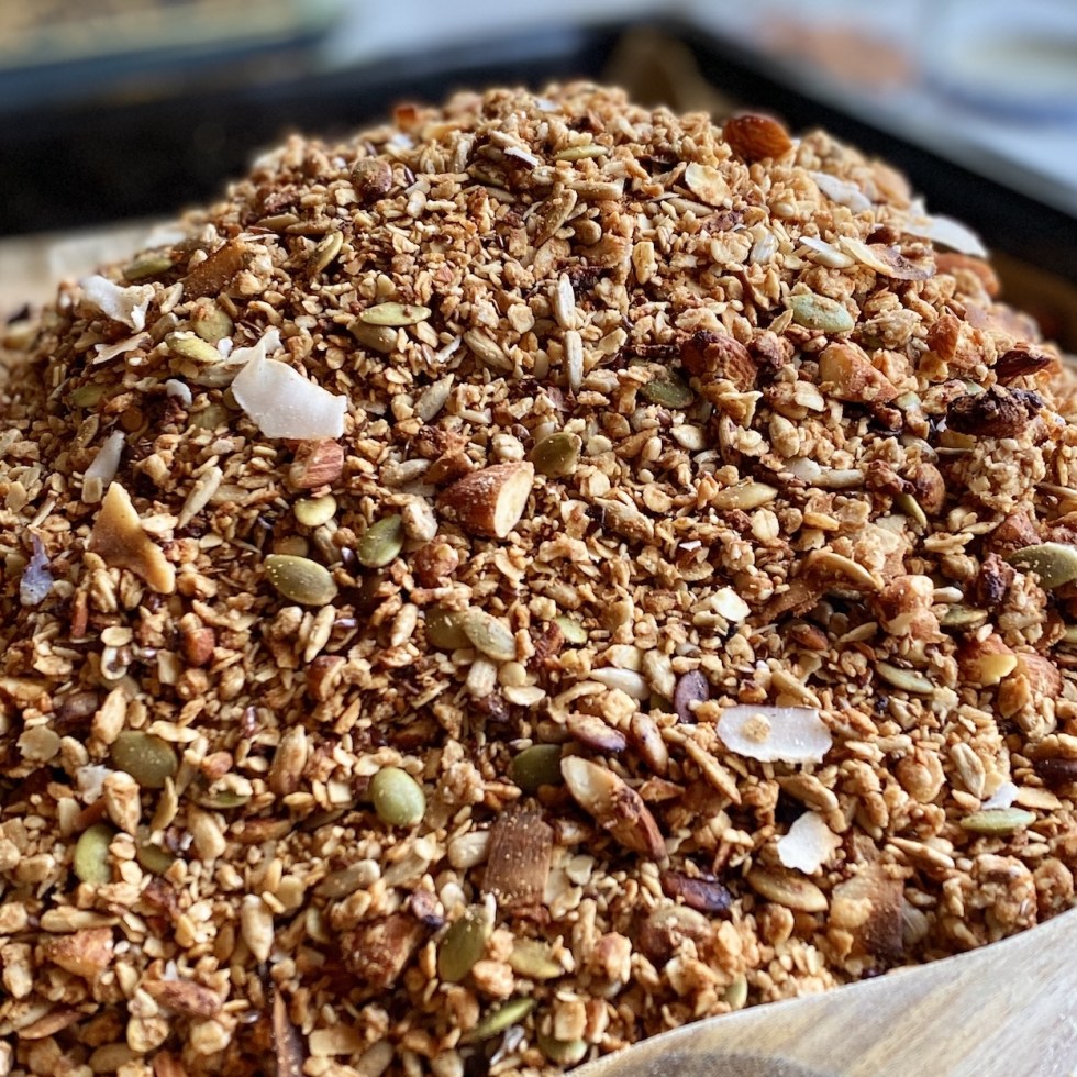 Hjemmelaget granola med peanøttsmør, mandler og gojibær